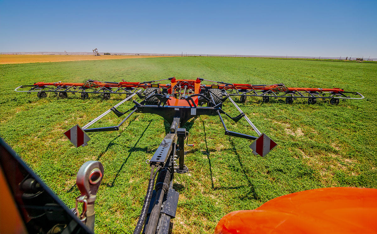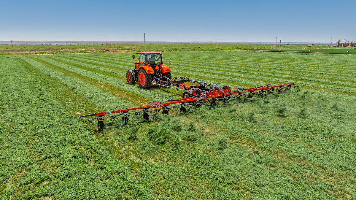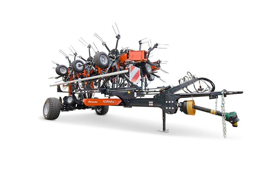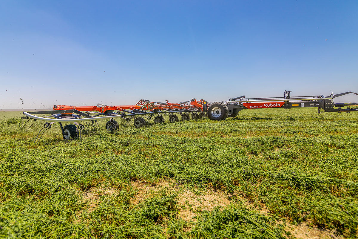 The premier tedder experience is easily found in the Kubota TE14515C and its 51'2” working width makes haymaking efficient! The tedder’s Super-C tines spread the crop in an inverted fashion, meaning the lower crop is placed on top, providing you with an even dry down. Kubota’s commitment to durability is showcased in the tedder’s rotor gearbox and chassis, and with a transport width of just 9'8” you’ll swear the TE14515C is your new best friend.